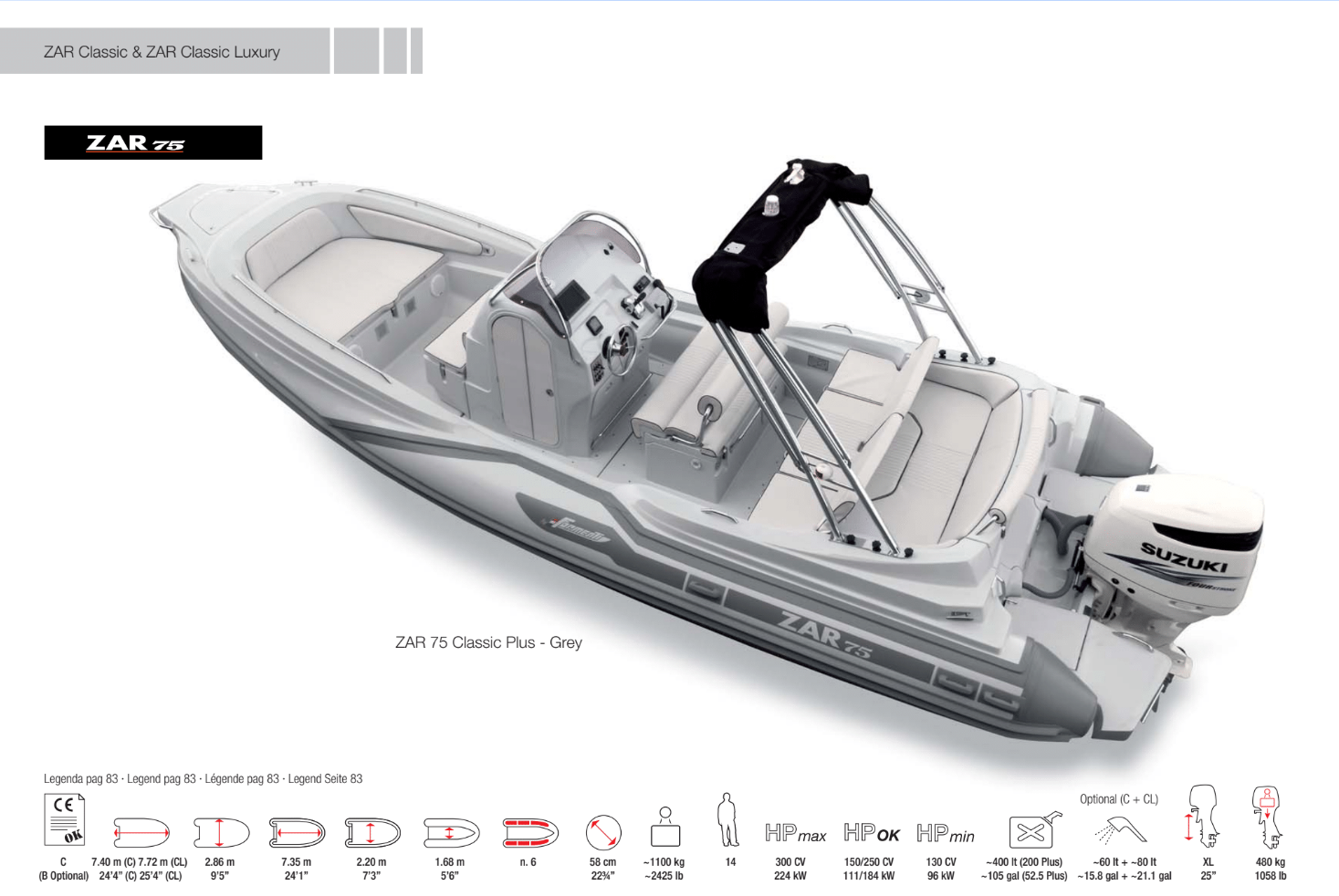 - Peso del battello a secco kg 1.100 (con equipaggiamenti di serie, senza liquidi, senza motore); dato variabile ± 10%